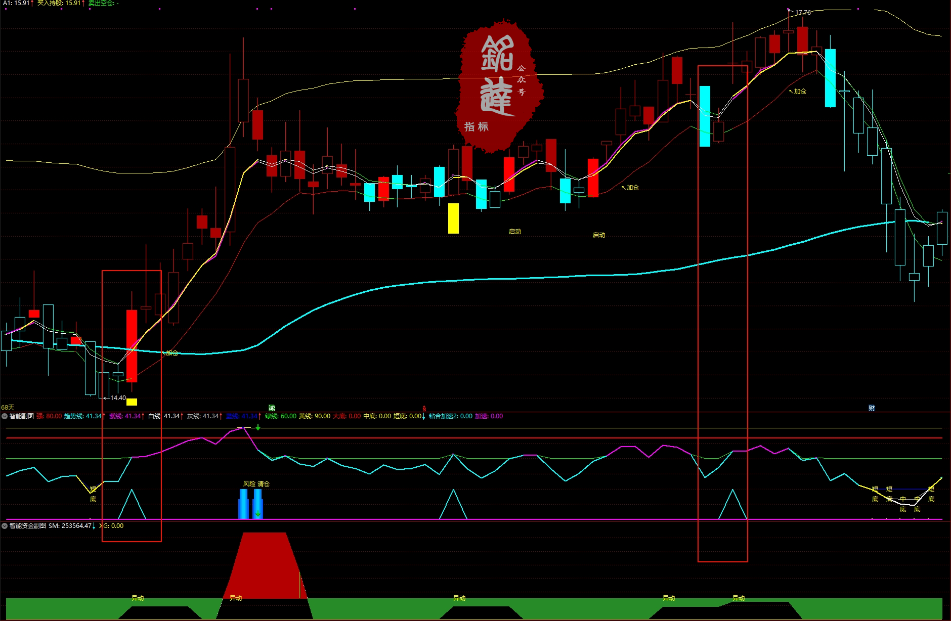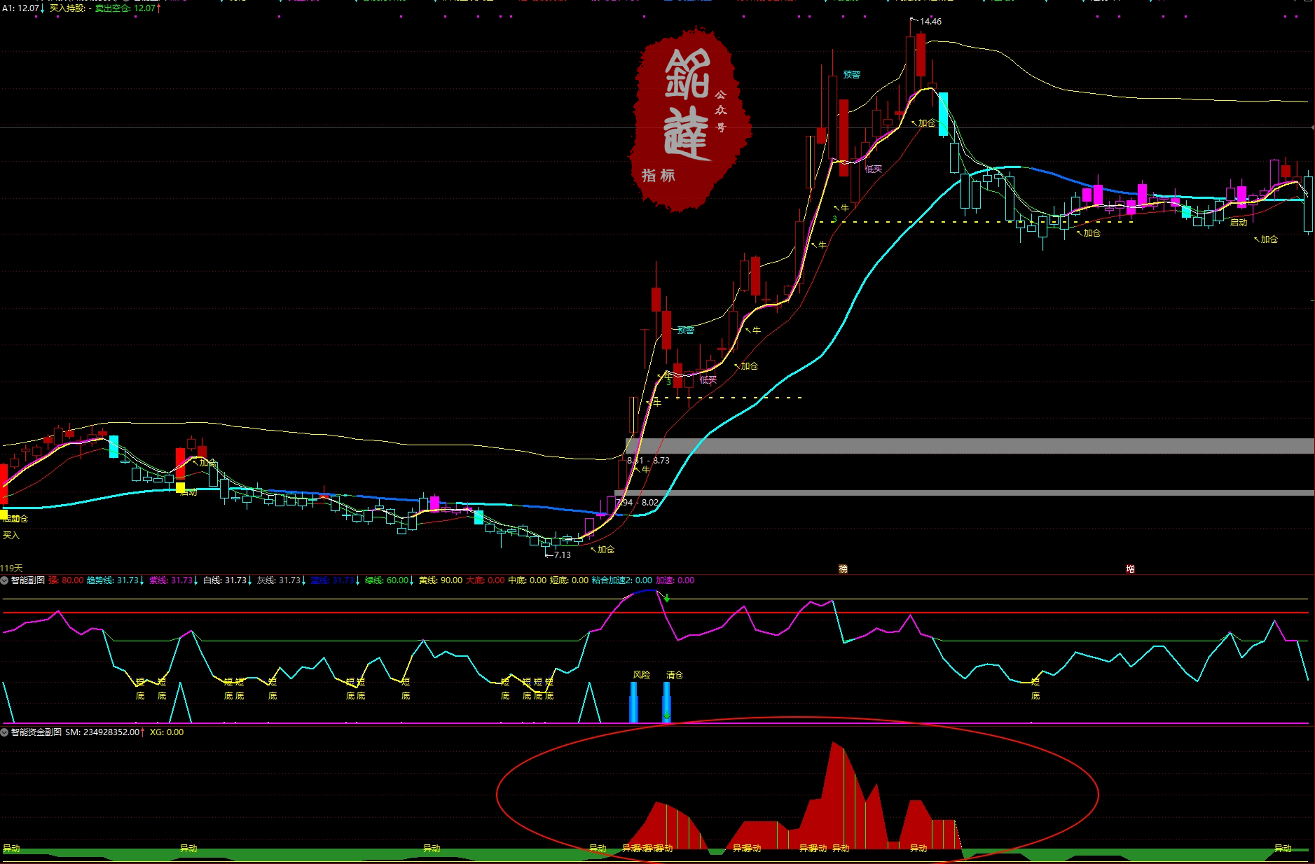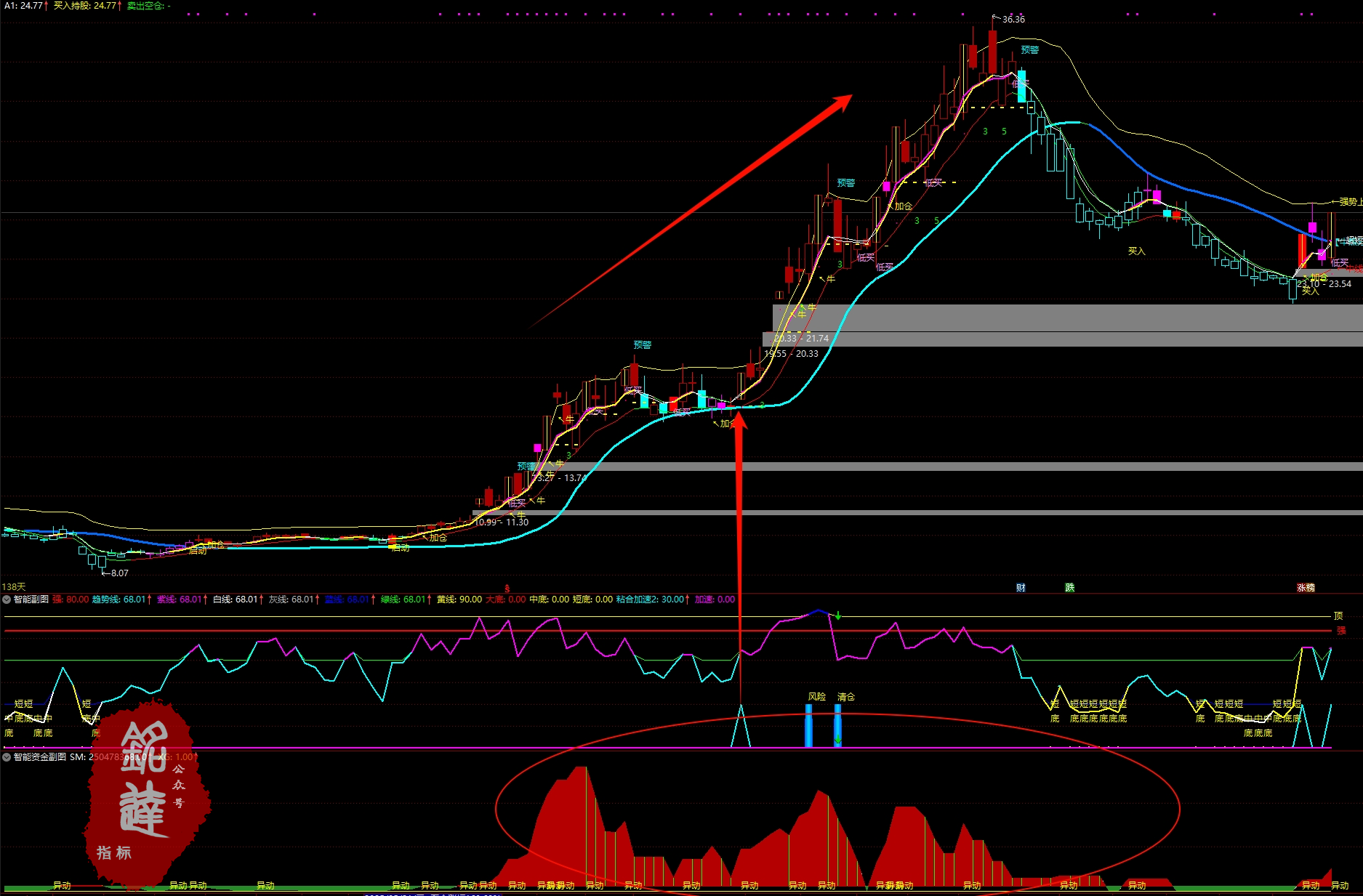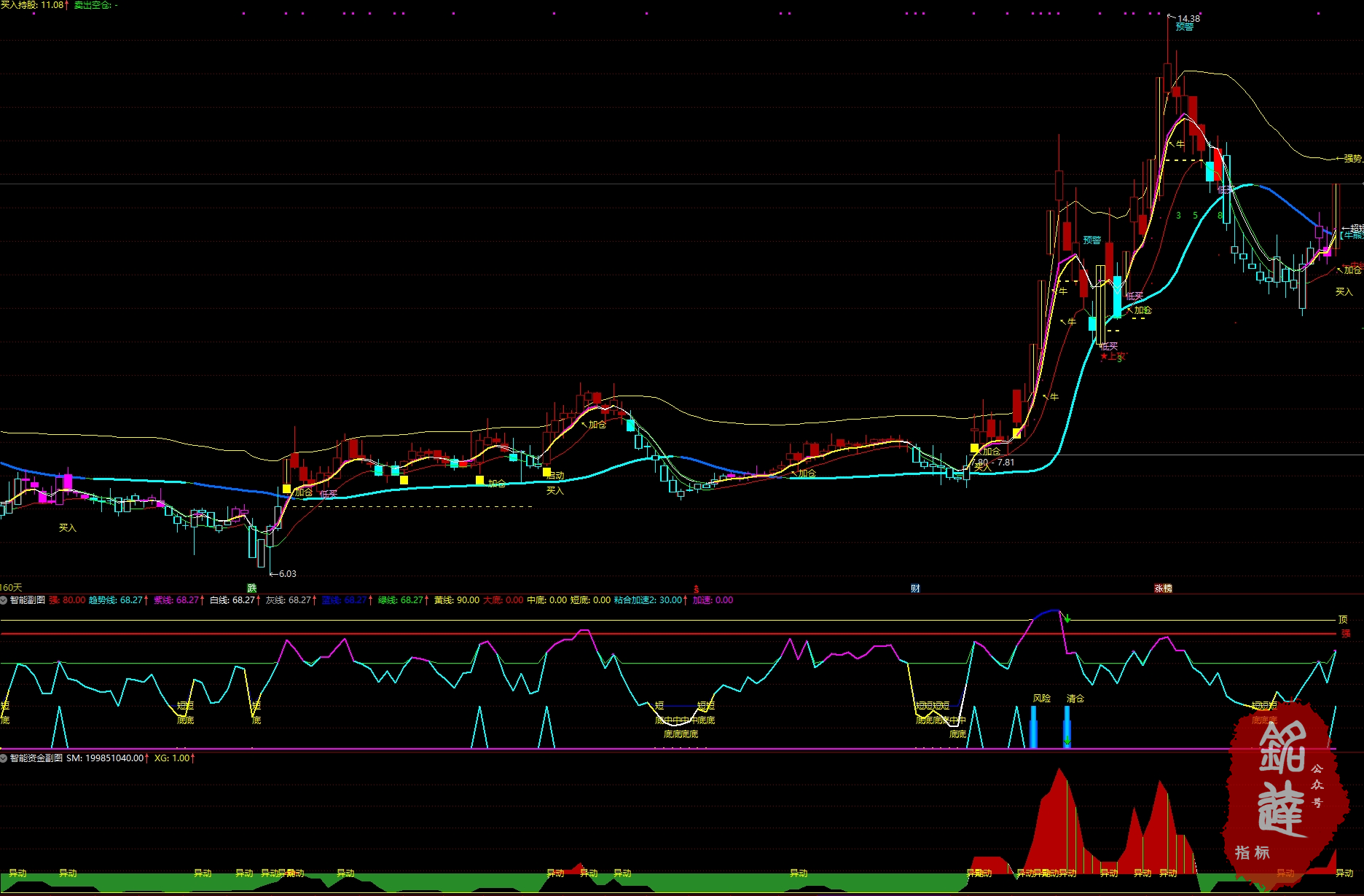 “智能操盘系统”套系指标,这是由三个互相关联的指标组成的套系,包括“智能主图”、“智能资金”副图以及“智能副图",并附带选股指标,这套指标旨在辅助我们更好地分析走势、根据套装的共振信号制定交易策略。